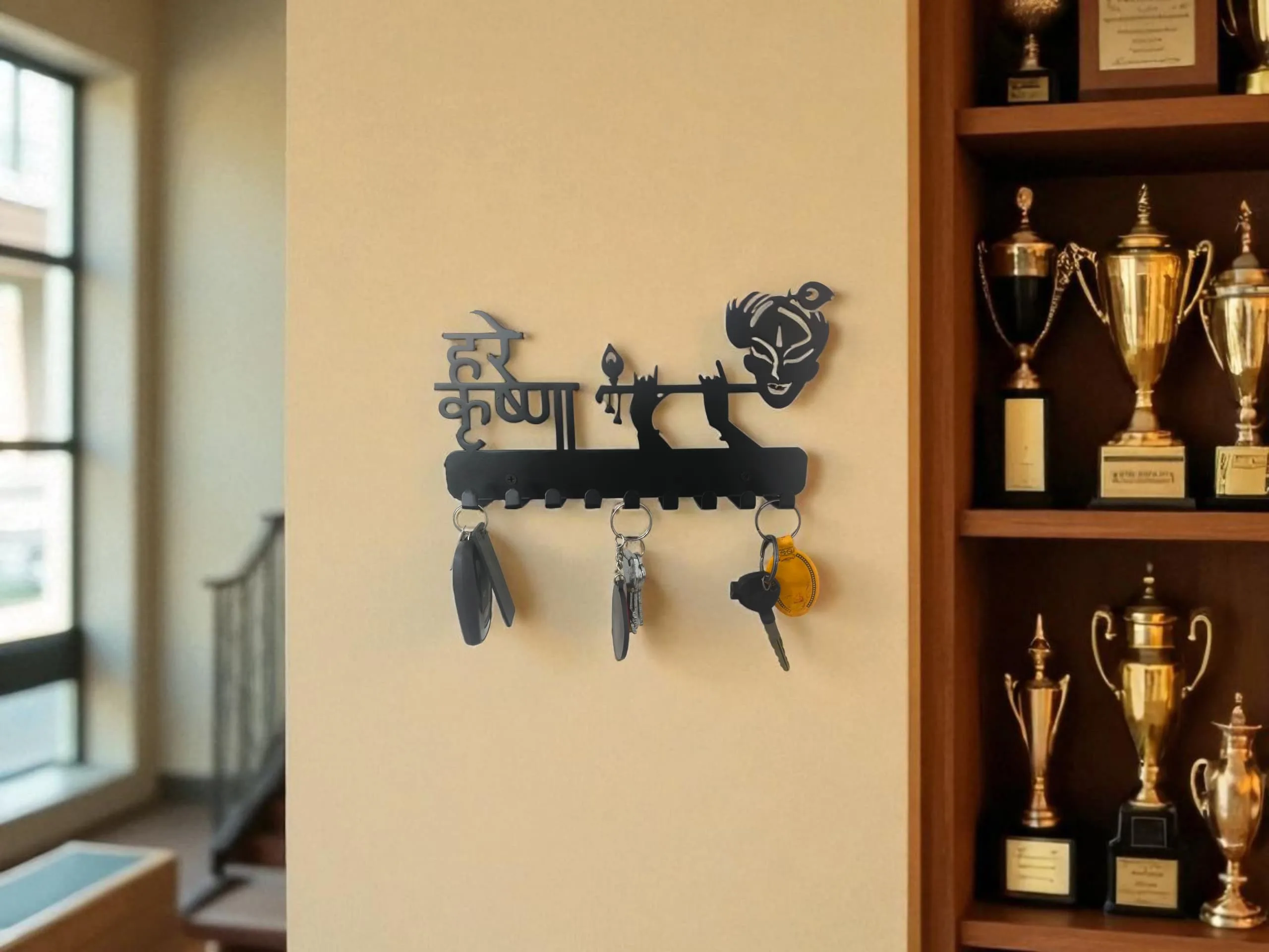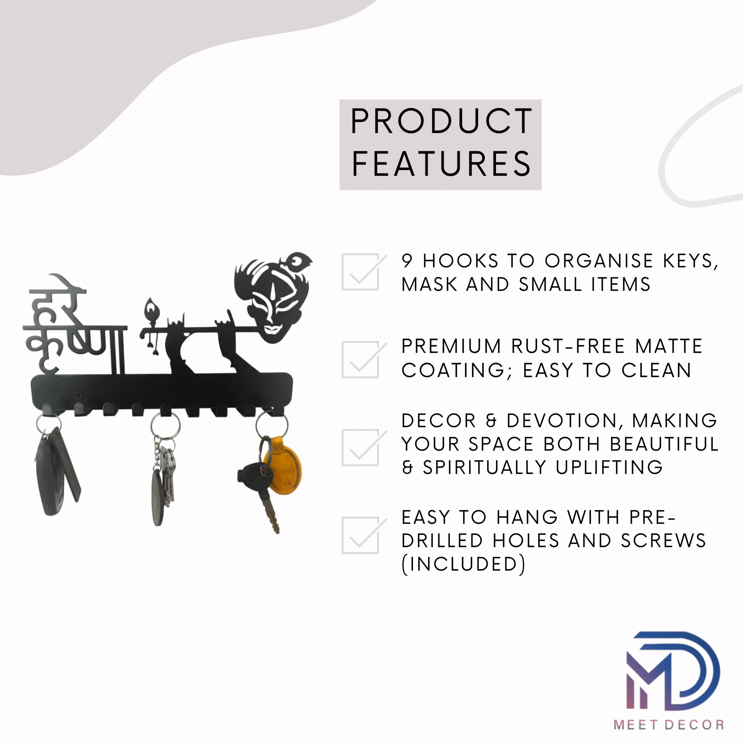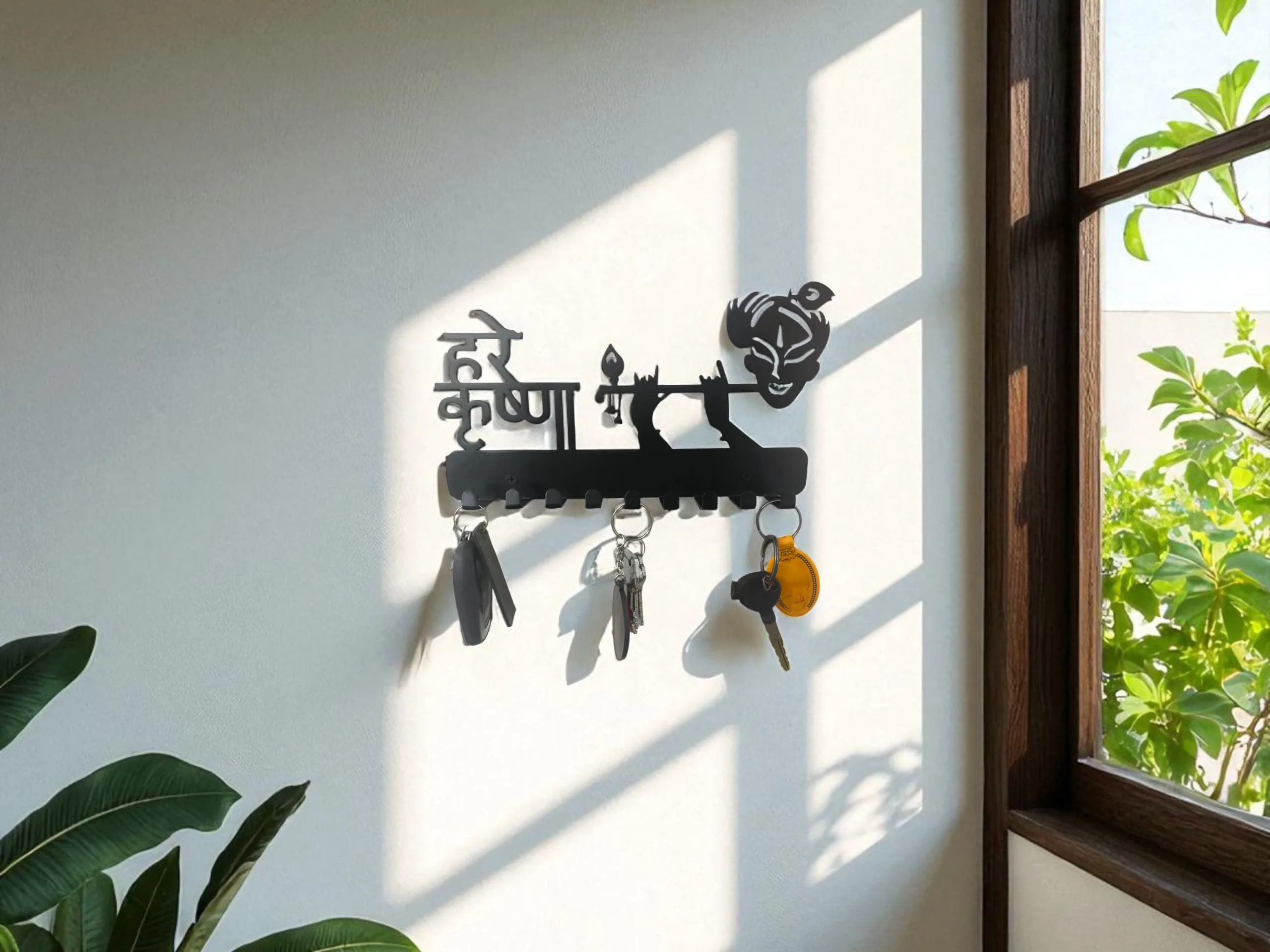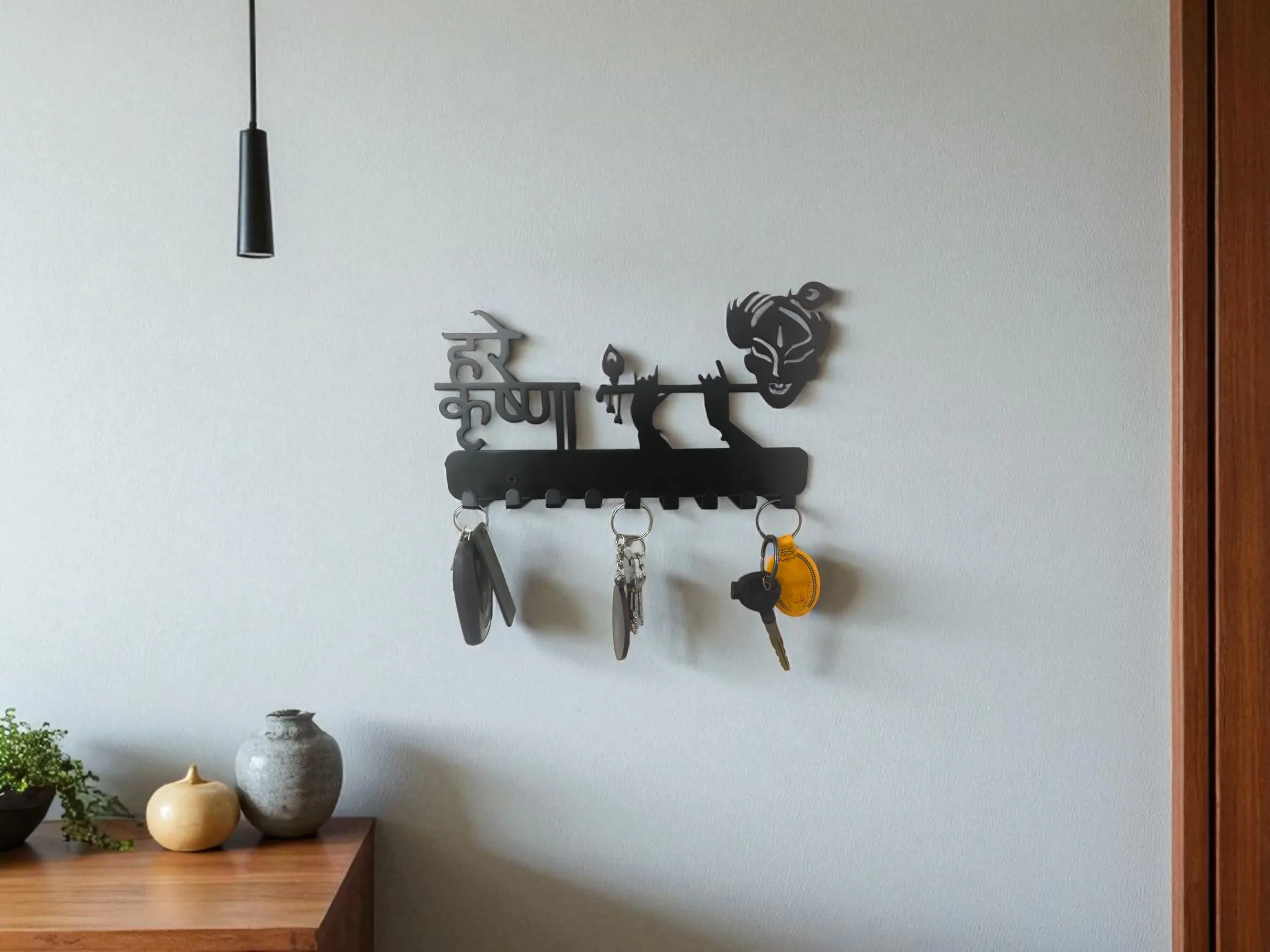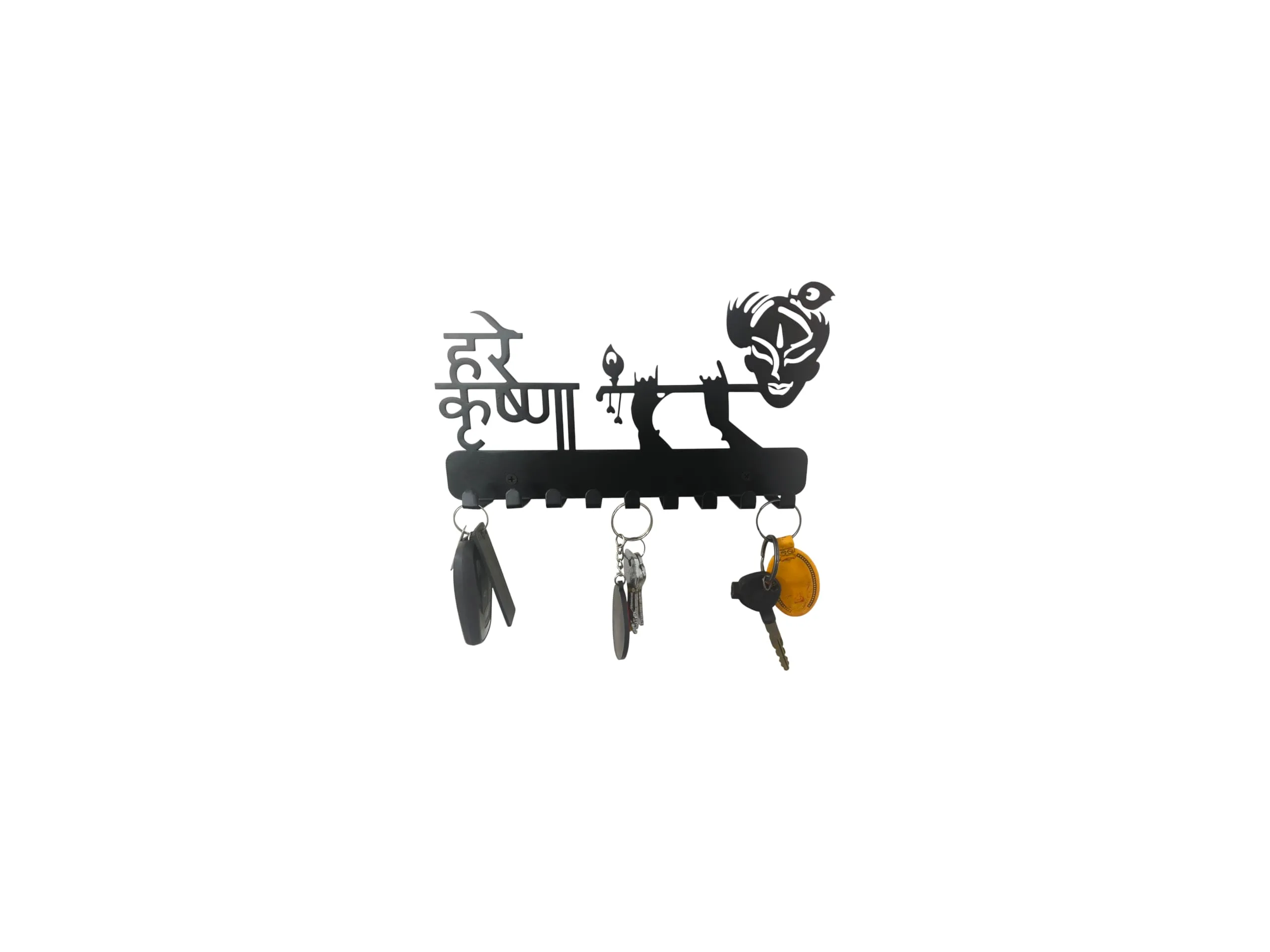Transform your home entryway with this Metal Krishna with Flute Design Key Holder, combining spiritual elegance and superior utility. Inspired by top-rated Indian listings, this key holder features a distinctive silhouette of Lord Krishna playing the flute, making it an eye-catching wall accent as well as an organizational tool. Dimensions: 27cm (L) x 16cm (H) Material: High-grade metal (iron/steel), powder-coated for rust resistance and longevity. Design: Indian art-inspired Krishna flute motif with Hindi inscription, suitable for modern, traditional, and eclectic home décor. Hooks: 9 sturdy hooks allow you to organize multiple sets of home, car, locker keys, and small accessories. Spaced for easy access, no overlapping or tangling. Finish: Elegant black matte finish fits seamlessly on light or dark colored walls. Install: Two pre-drilled holes for effortless wall mounting, installation hardware included