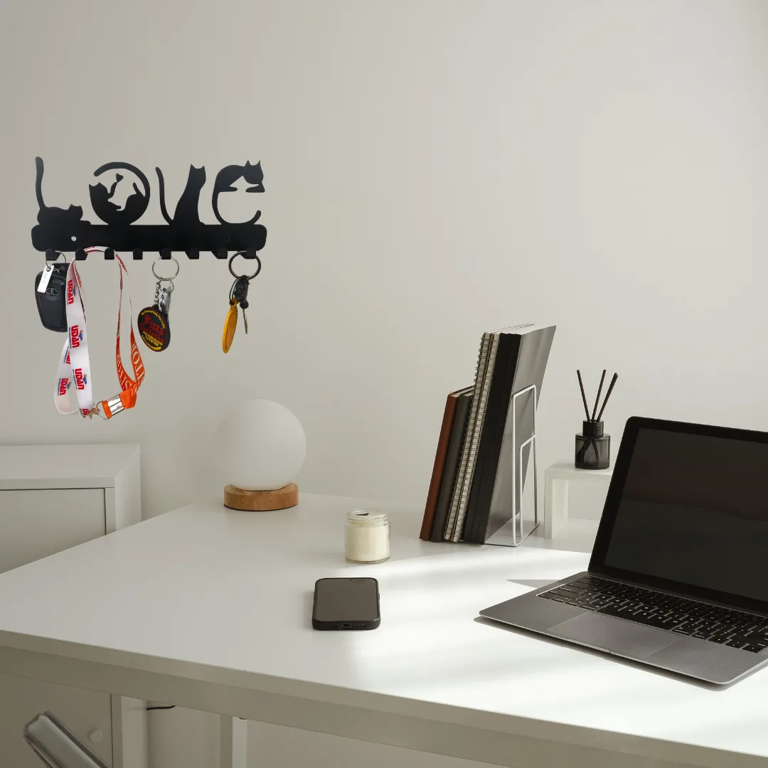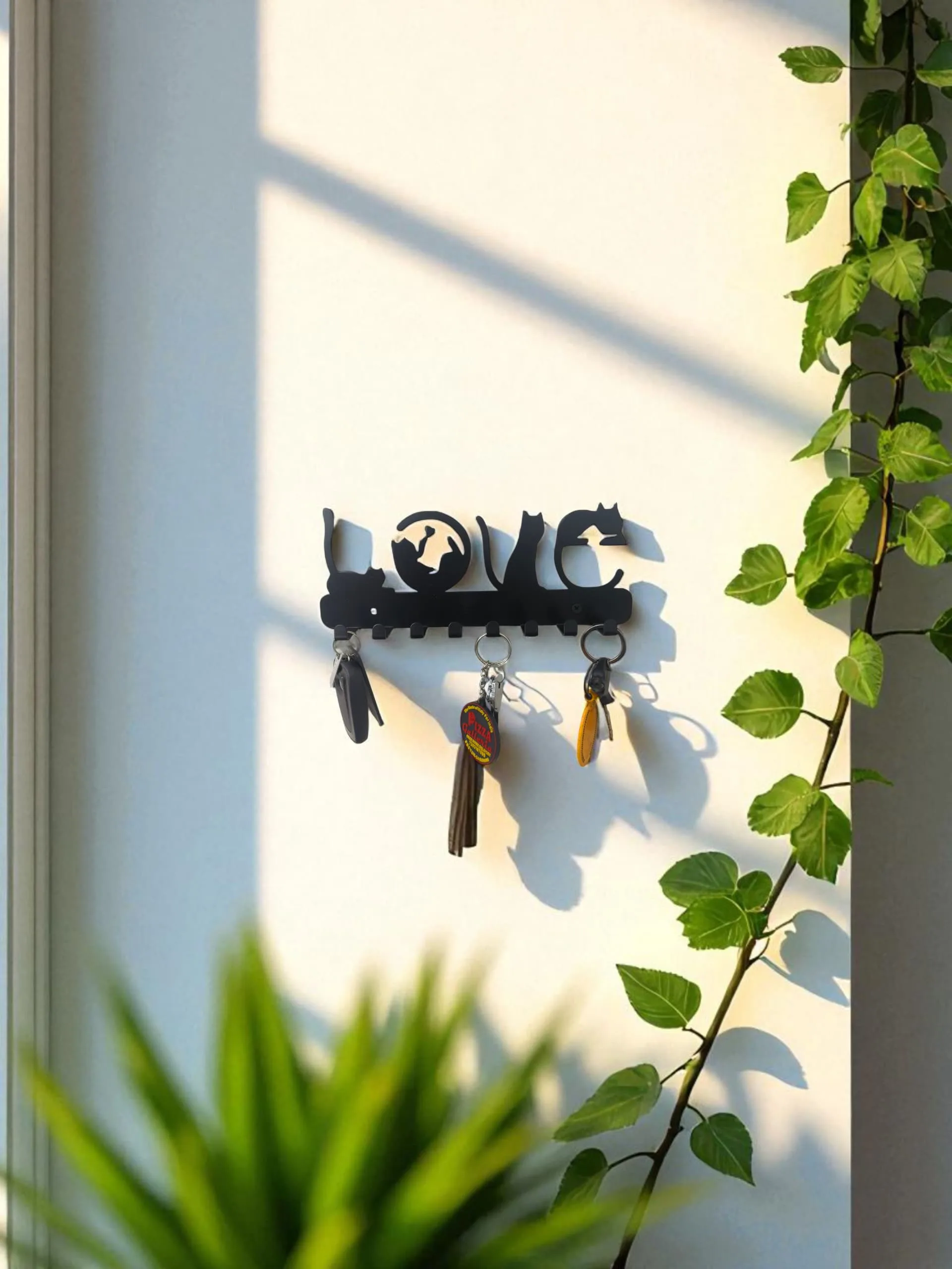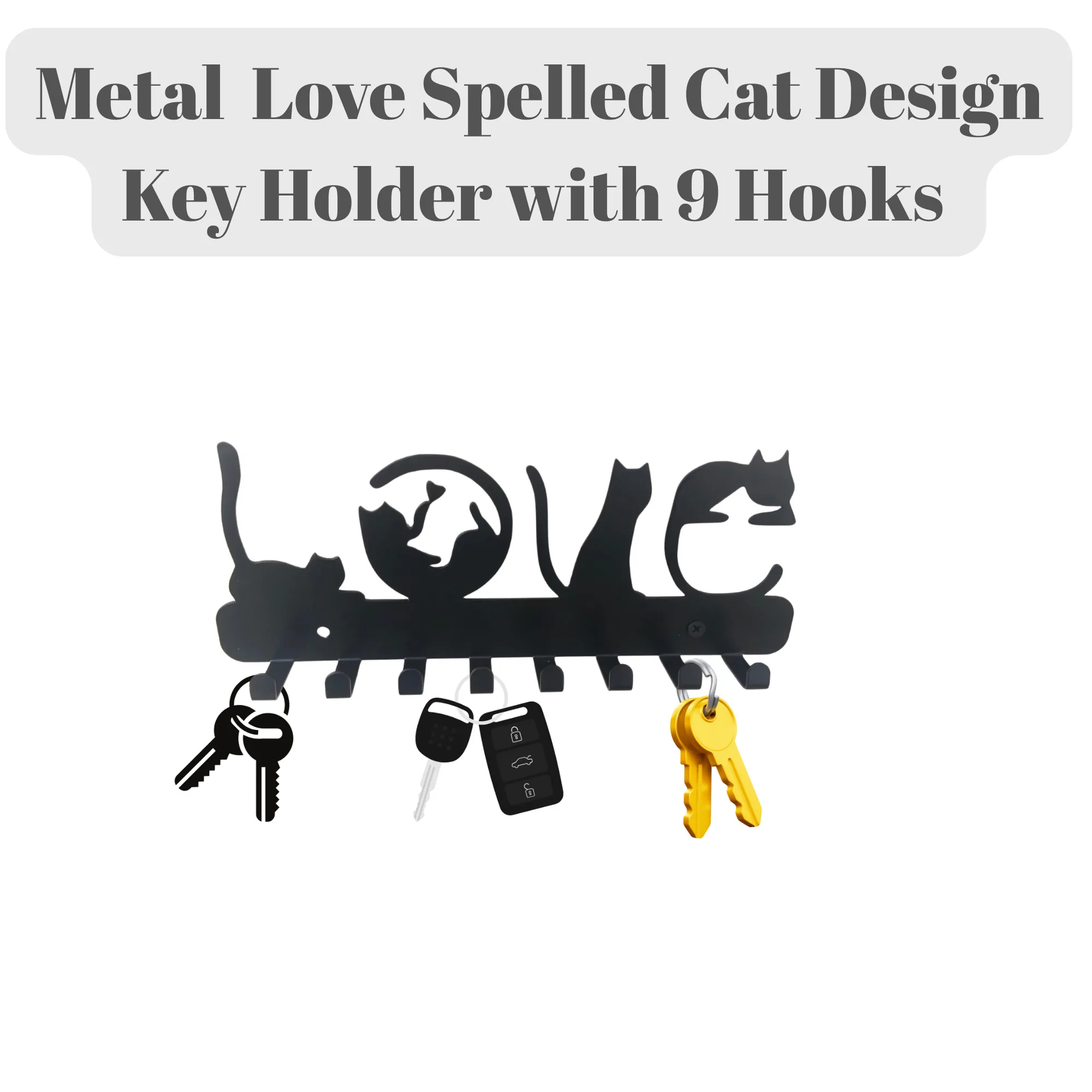 Transform your entryway or workspace with this Metal Love Spelled Cat Design Key Holder. The powder-coated black finish delivers striking style and rust-free durability, while the creative cat silhouette brings joy to any setting. Measuring 27cm x 16cm and outfitted with 9 strong hooks, it’s ideal for organizing everything from keys and remotes to masks and jewelry. Installation is simple with included hardware, and routine cleaning is easy—just wipe to refresh the gloss. This key holder combines functional capacity with adorable charm, blending seamlessly into modern, classic, or eclectic décor. Place it in high-traffic areas for quick access, or gift it to pet-loving friends and family for a guaranteed smile. Quality Metal Construction: Crafted from powder-coated metal for lasting shine and rust resistance. Large Capacity: 27cm (length) x 16cm (height) frame holds 9 hooks—perfect for busy families or shared workspaces. Distinctive LOVE Cat Design: Cat-shaped letters spell “LOVE” for a whimsical, modern accent. 9 Deep Hooks: Sturdy hooks for organizing all your keys, car remotes, lanyards, and lightweight accessories. Easy Wall Mounting: Includes pre-drilled holes and mounting hardware for secure installation. Versatile Usage: Hang keys, masks, smart cards, jewelry, or other essentials in entryways, kitchens, bedrooms, or offices. Effortless Cleaning: Wipe gently with a soft, dry cloth to maintain its elegant finish. Safe for Accessories: Smooth hooks protect keys and prevent scratching or tangling. Ideal for Gifting: The charming cat motif is a perfect gift for cat lovers or for special occasions