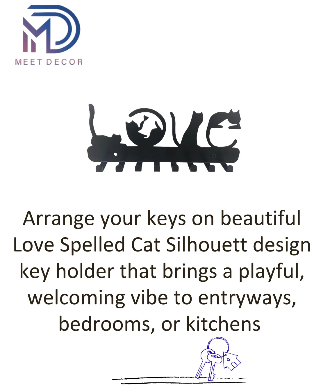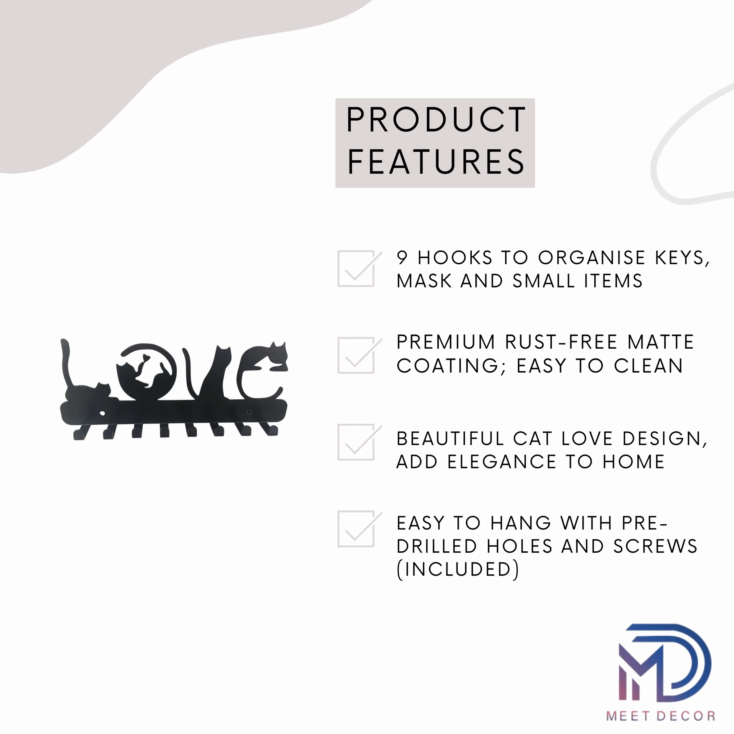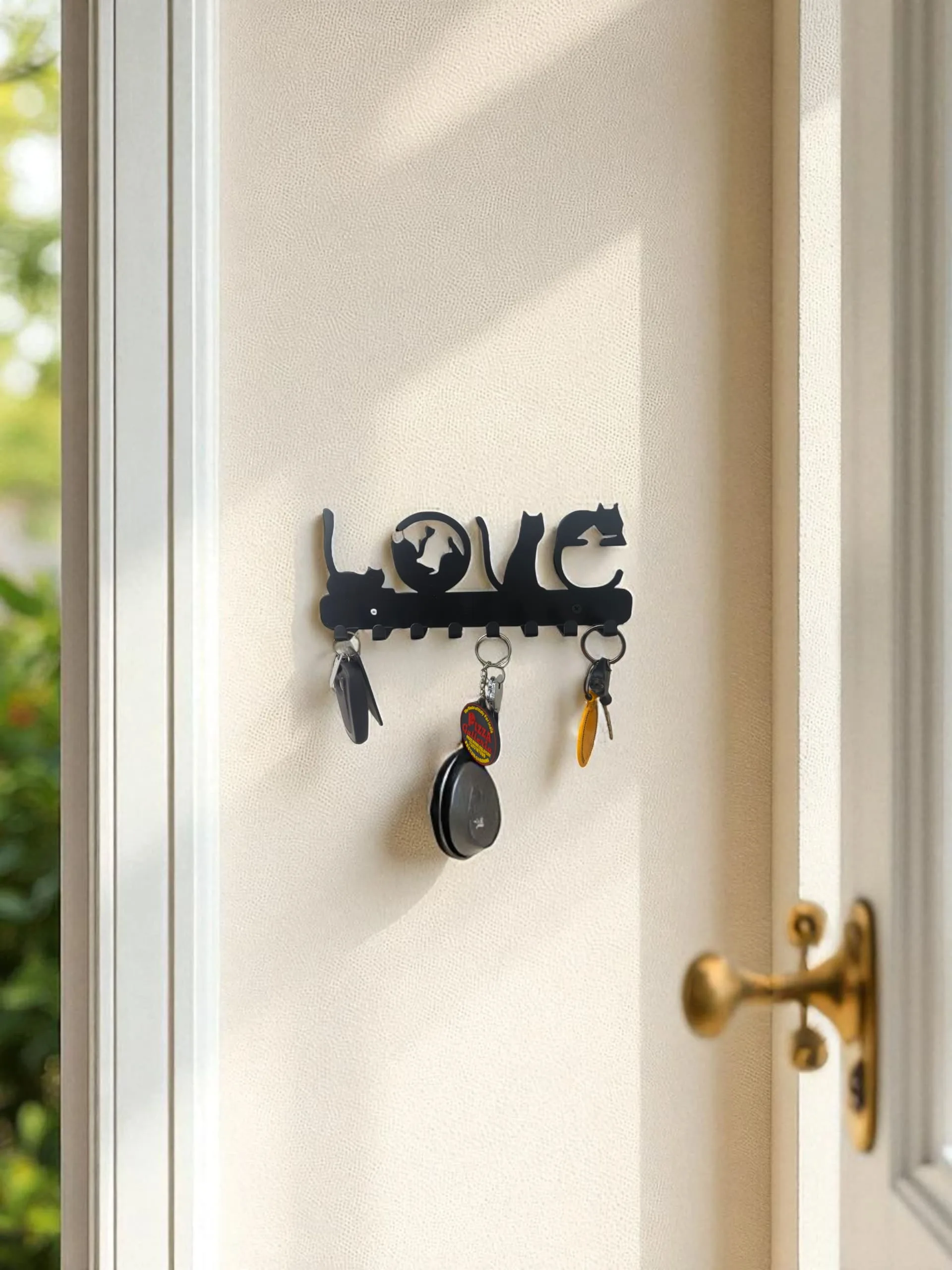 Transform your entryway or workspace with this Metal Love Spelled Cat Design Key Holder. The powder-coated black finish delivers striking style and rust-free durability, while the creative cat silhouette brings joy to any setting. Measuring 27cm x 16cm and outfitted with 9 strong hooks, it’s ideal for organizing everything from keys and remotes to masks and jewelry. Installation is simple with included hardware, and routine cleaning is easy—just wipe to refresh the gloss. This key holder combines functional capacity with adorable charm, blending seamlessly into modern, classic, or eclectic décor. Place it in high-traffic areas for quick access, or gift it to pet-loving friends and family for a guaranteed smile. Quality Metal Construction: Crafted from powder-coated metal for lasting shine and rust resistance. Large Capacity: 27cm (length) x 16cm (height) frame holds 9 hooks—perfect for busy families or shared workspaces. Distinctive LOVE Cat Design: Cat-shaped letters spell “LOVE” for a whimsical, modern accent. 9 Deep Hooks: Sturdy hooks for organizing all your keys, car remotes, lanyards, and lightweight accessories. Easy Wall Mounting: Includes pre-drilled holes and mounting hardware for secure installation. Versatile Usage: Hang keys, masks, smart cards, jewelry, or other essentials in entryways, kitchens, bedrooms, or offices. Effortless Cleaning: Wipe gently with a soft, dry cloth to maintain its elegant finish. Safe for Accessories: Smooth hooks protect keys and prevent scratching or tangling. Ideal for Gifting: The charming cat motif is a perfect gift for cat lovers or for special occasions